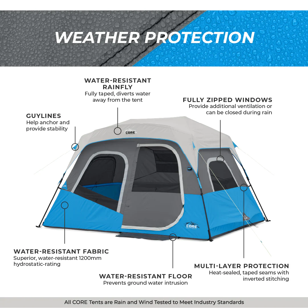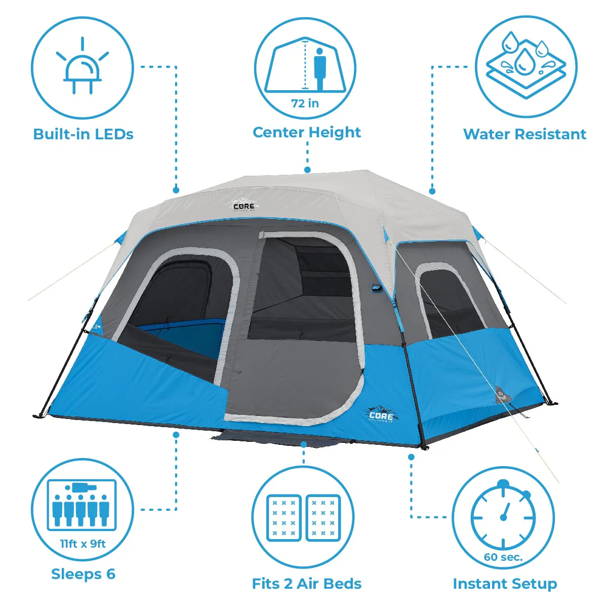 Core Equipment 6 Persons 11 x 9 Feet Lighted Instant Cabin Camping Tent