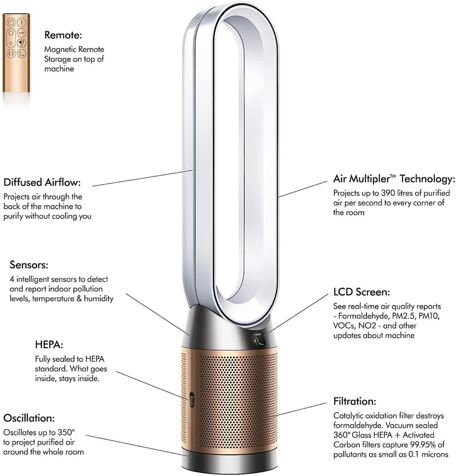 Dyson Cool formaldehyde Air Purifier TP09, Wi-Fi Enabled, White & Gold Color, 3 Pin UK/UAE Plug Original with 2 Years Dyson Warranty