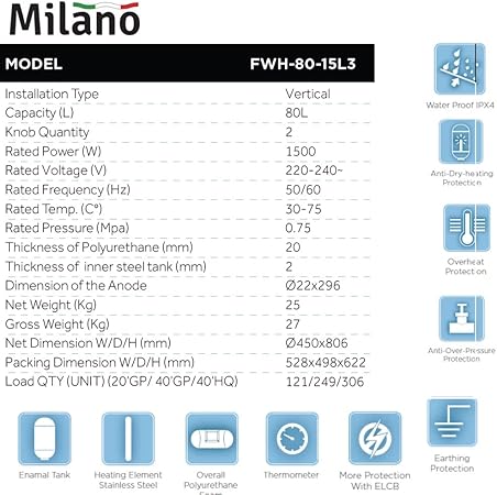 Milano 80L Vertical Electric Water Heater, Italian Design 1.5kW with 7 Years Warranty